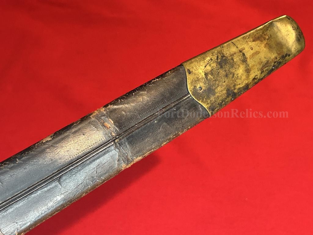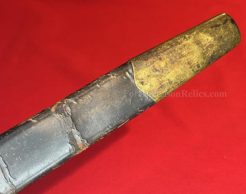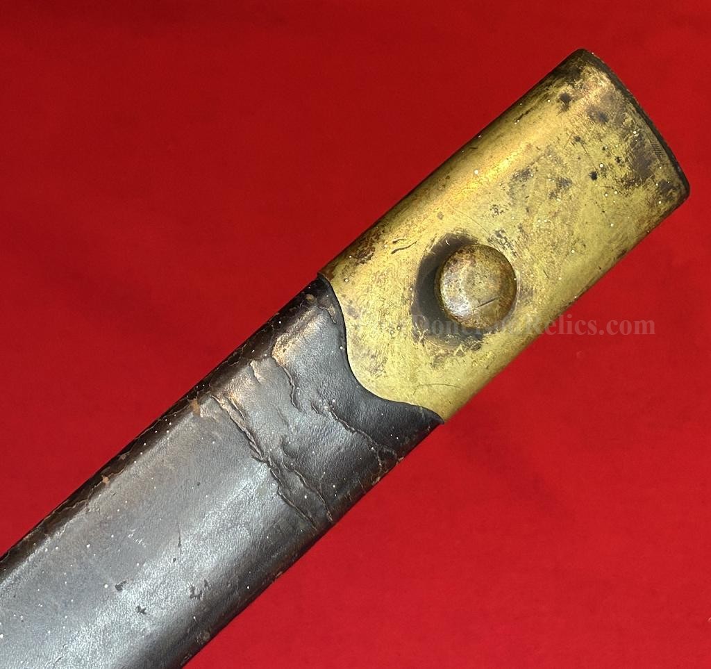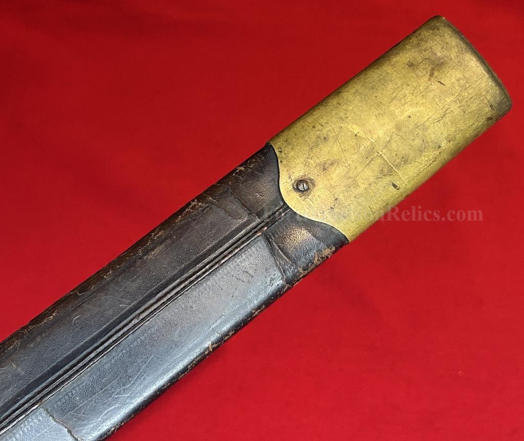 The leather scabbard is present and is in good condition. There are no markings noted. The brass throat and drag are present and matches the sword handle and guard perfectly. The throat still retains the stud which would have attached it to the baldric that would have been worn with the sword. This is an attractive sword that would enhance any display!