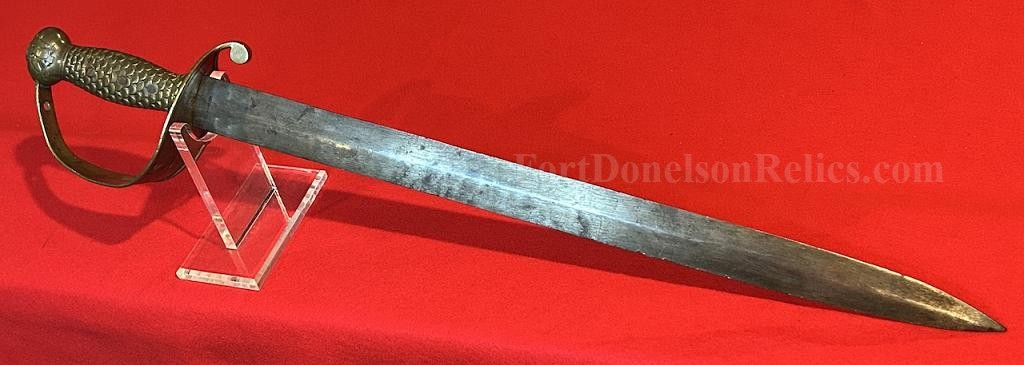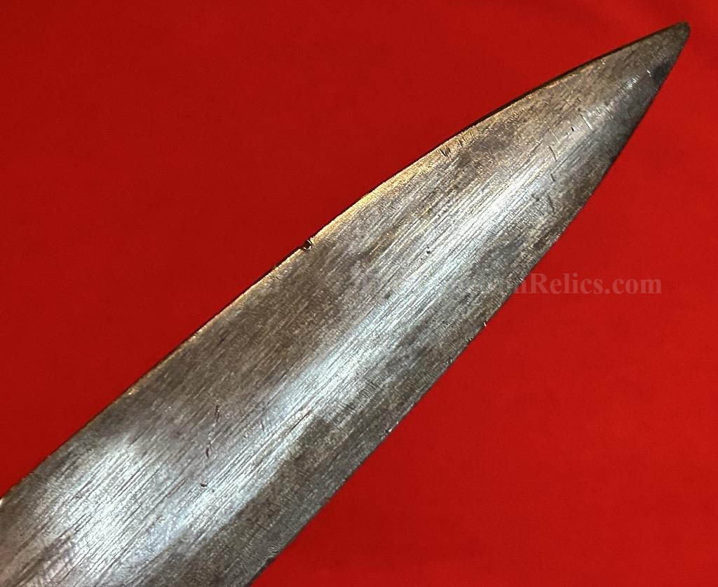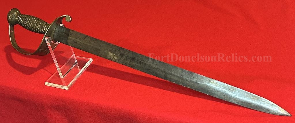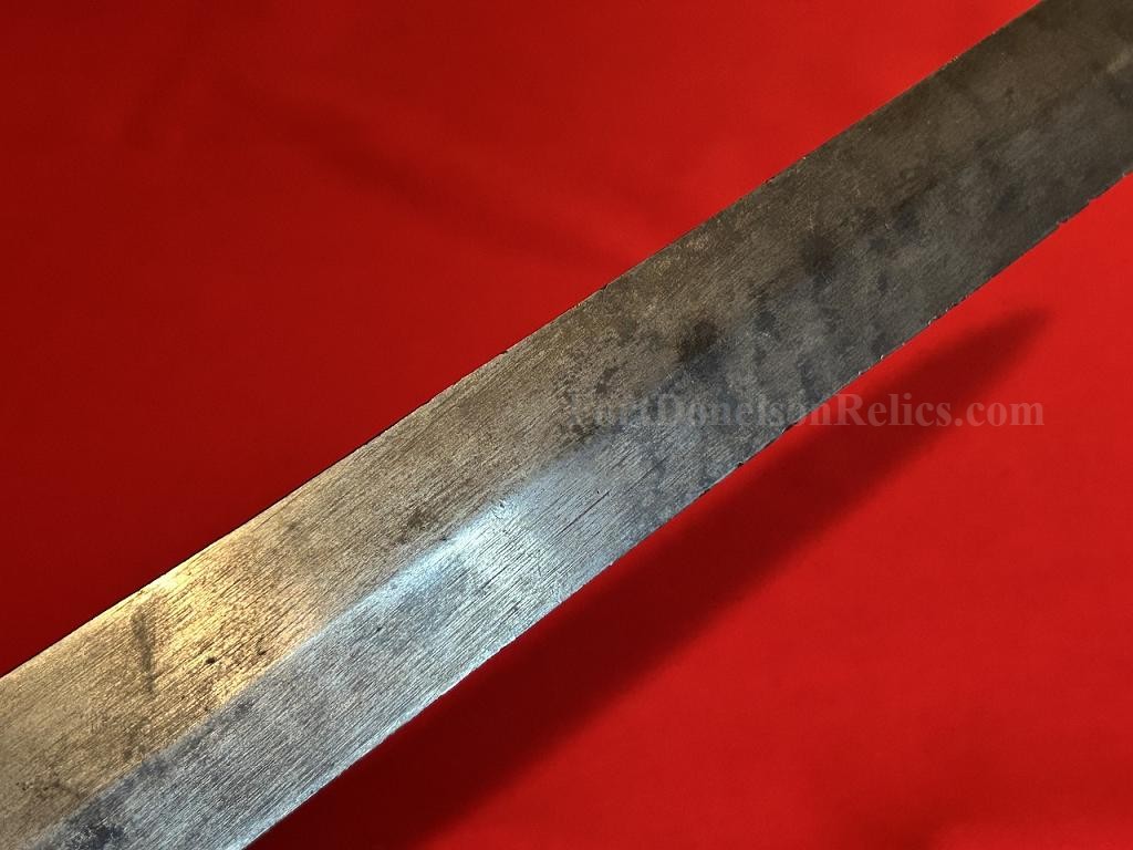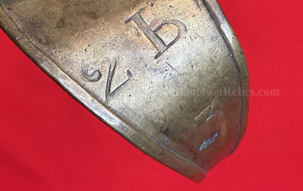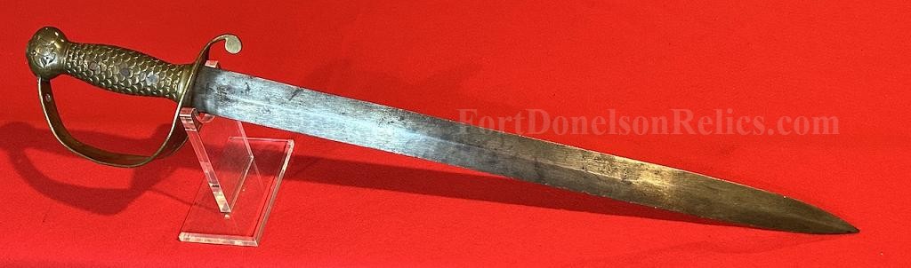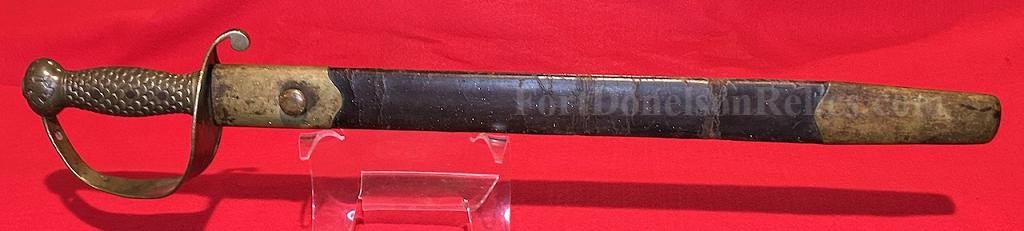 The leather scabbard is present and is in good condition. There are no markings noted. The brass throat and drag are present and matches the sword handle and guard perfectly. The throat still retains the stud which would have attached it to the baldric that would have been worn with the sword. This is an attractive sword that would enhance any display!