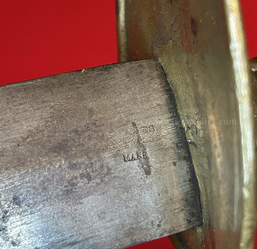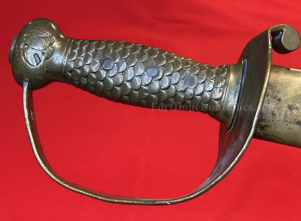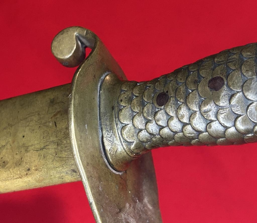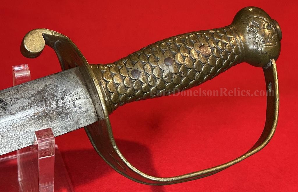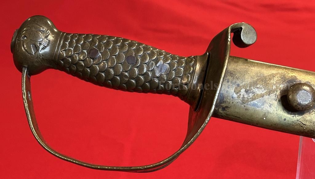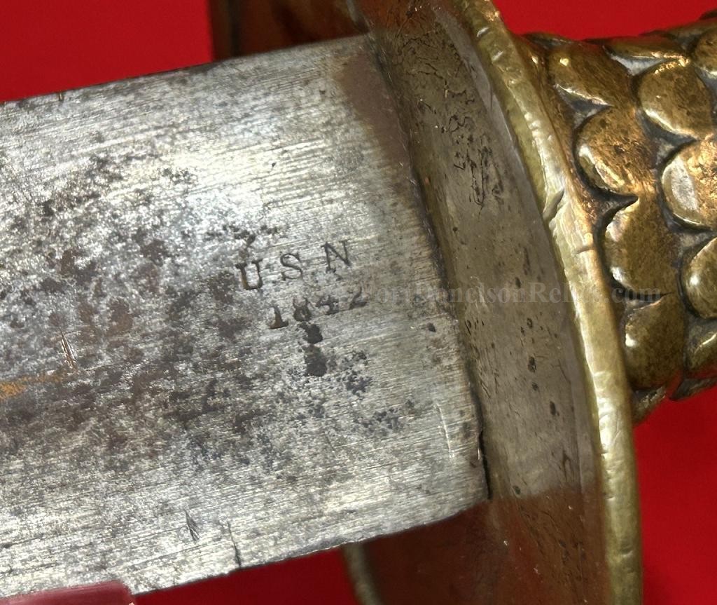 A super cool M1841 US Naval Cutlass with scabbard by Ames Mfg Company. The blade has a nice gun metal gray tone throughout. One edge of the blade has several flea bites down the blade while the other side is for the most part smooth. You can see near the guard on one side, "U.S.N. / 1842" and on the other, very faint is the "N.P. Ames / Cabotsville" mark, though the 'MASS' is still easily seen. Based on the date, we know this is one of the first 3,000 that were delivered to the Government; (500) March'42; (1,000) May'42; (1,500) Late'42. The brass guard has a nice dark mellow patina throughout, which along with the fish scale handle, the eagle motif on the pommel, and the nice wide guard, makes for a very impressive piece. On the guard you can see various alphanumeric stamps which are most likely rack numbers. "27" next to the blade on the guard, with the larger "2 b" & "3".