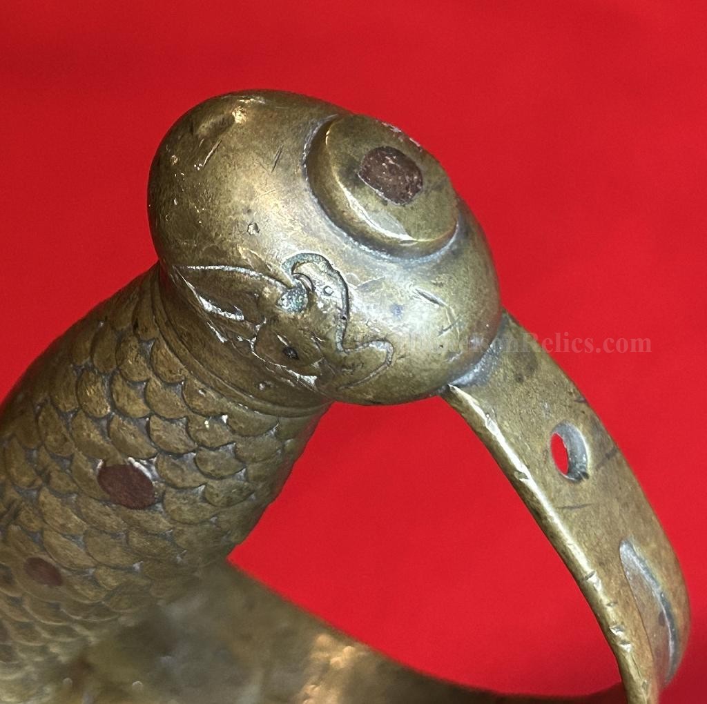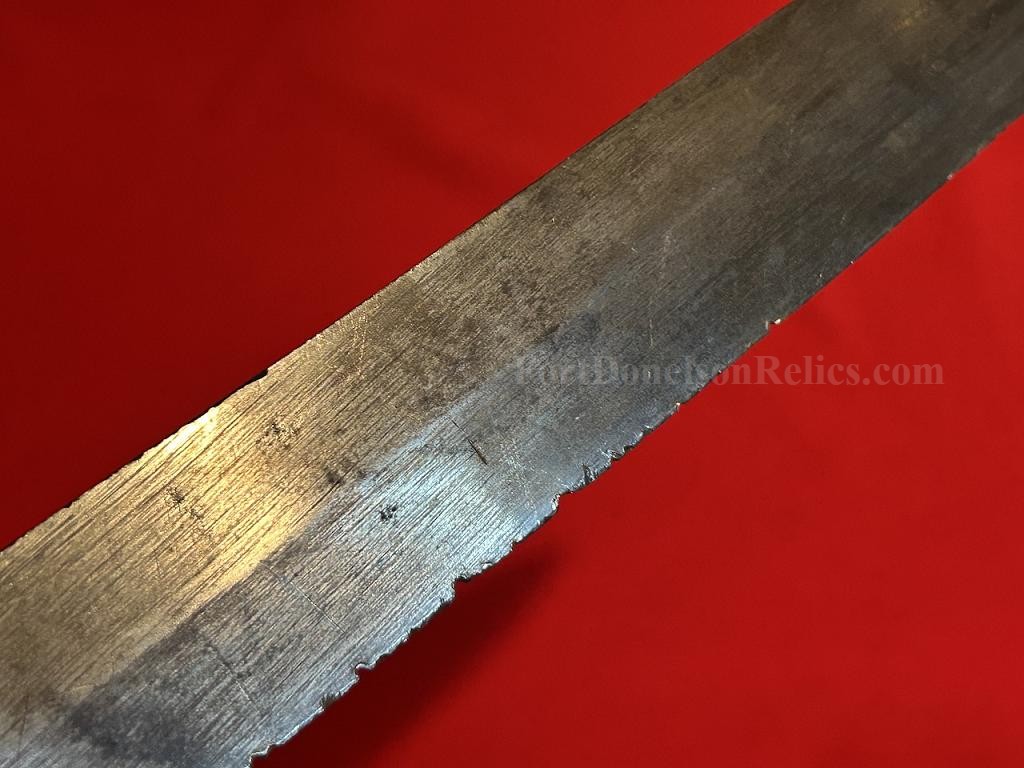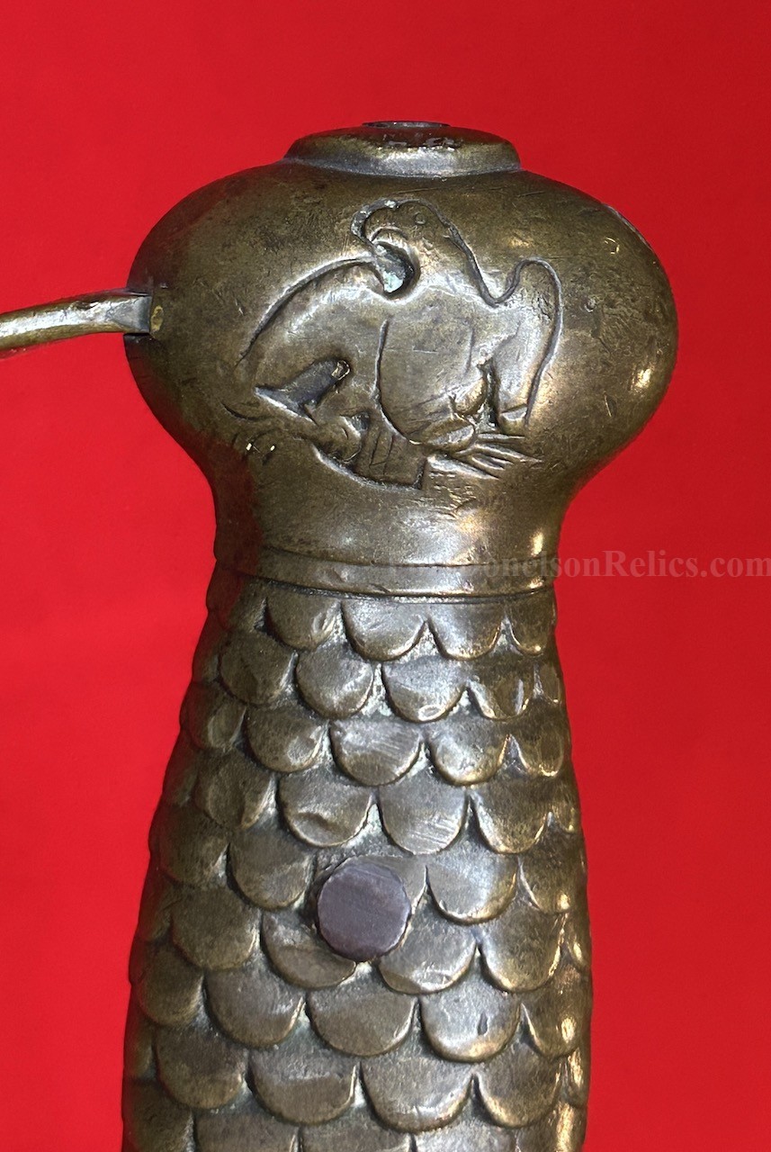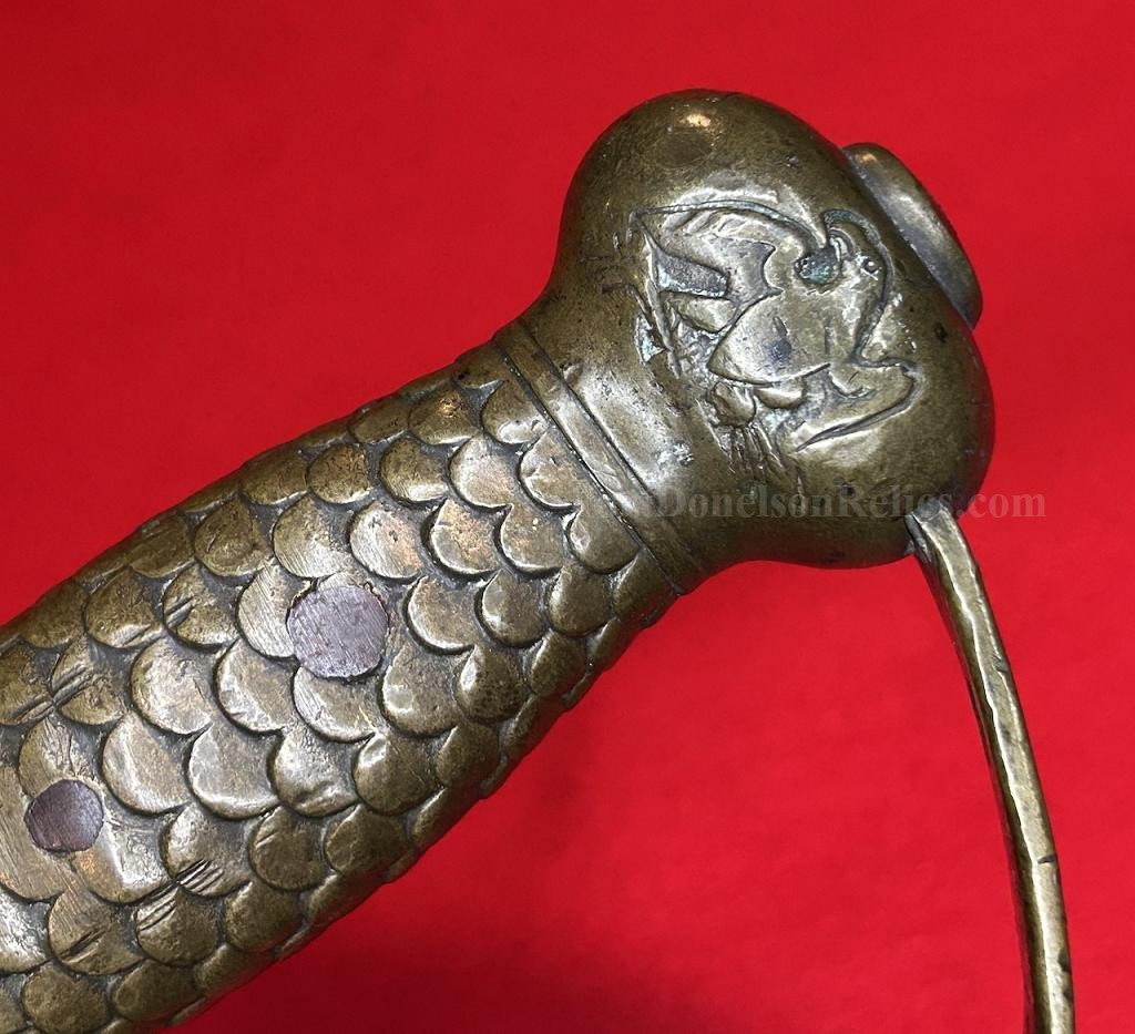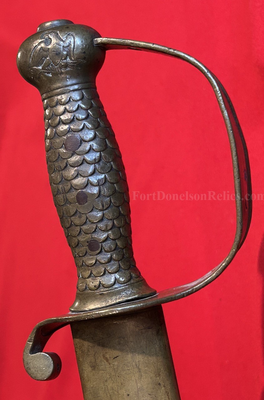 A super cool M1841 US Naval Cutlass with scabbard by Ames Mfg Company. The blade has a nice gun metal gray tone throughout. One edge of the blade has several flea bites down the blade while the other side is for the most part smooth. You can see near the guard on one side, "U.S.N. / 1842" and on the other, very faint is the "N.P. Ames / Cabotsville" mark, though the 'MASS' is still easily seen. Based on the date, we know this is one of the first 3,000 that were delivered to the Government; (500) March'42; (1,000) May'42; (1,500) Late'42. The brass guard has a nice dark mellow patina throughout, which along with the fish scale handle, the eagle motif on the pommel, and the nice wide guard, makes for a very impressive piece. On the guard you can see various alphanumeric stamps which are most likely rack numbers. "27" next to the blade on the guard, with the larger "2 b" & "3".