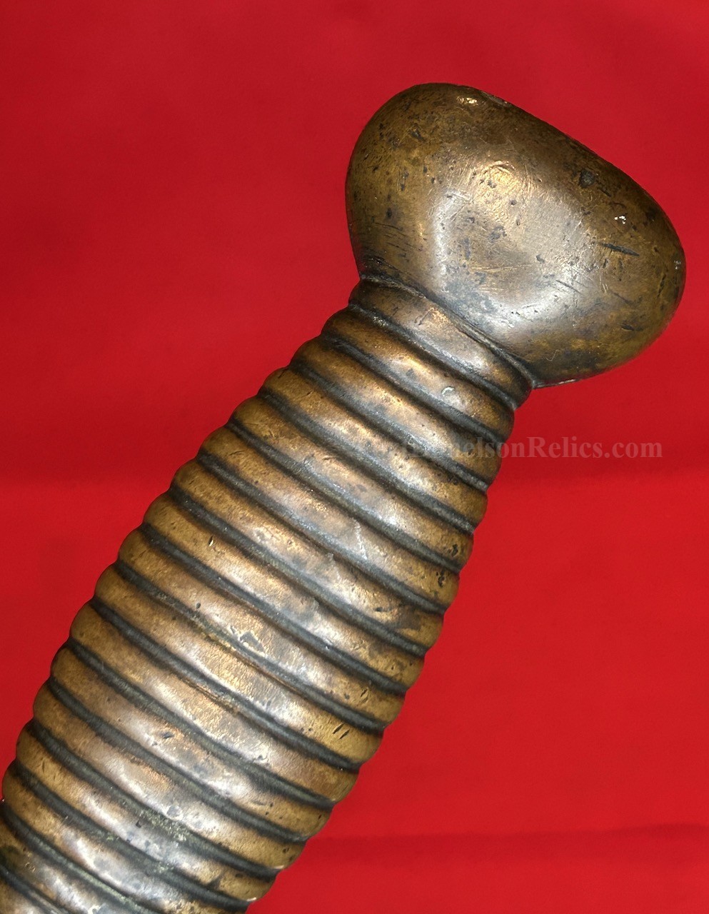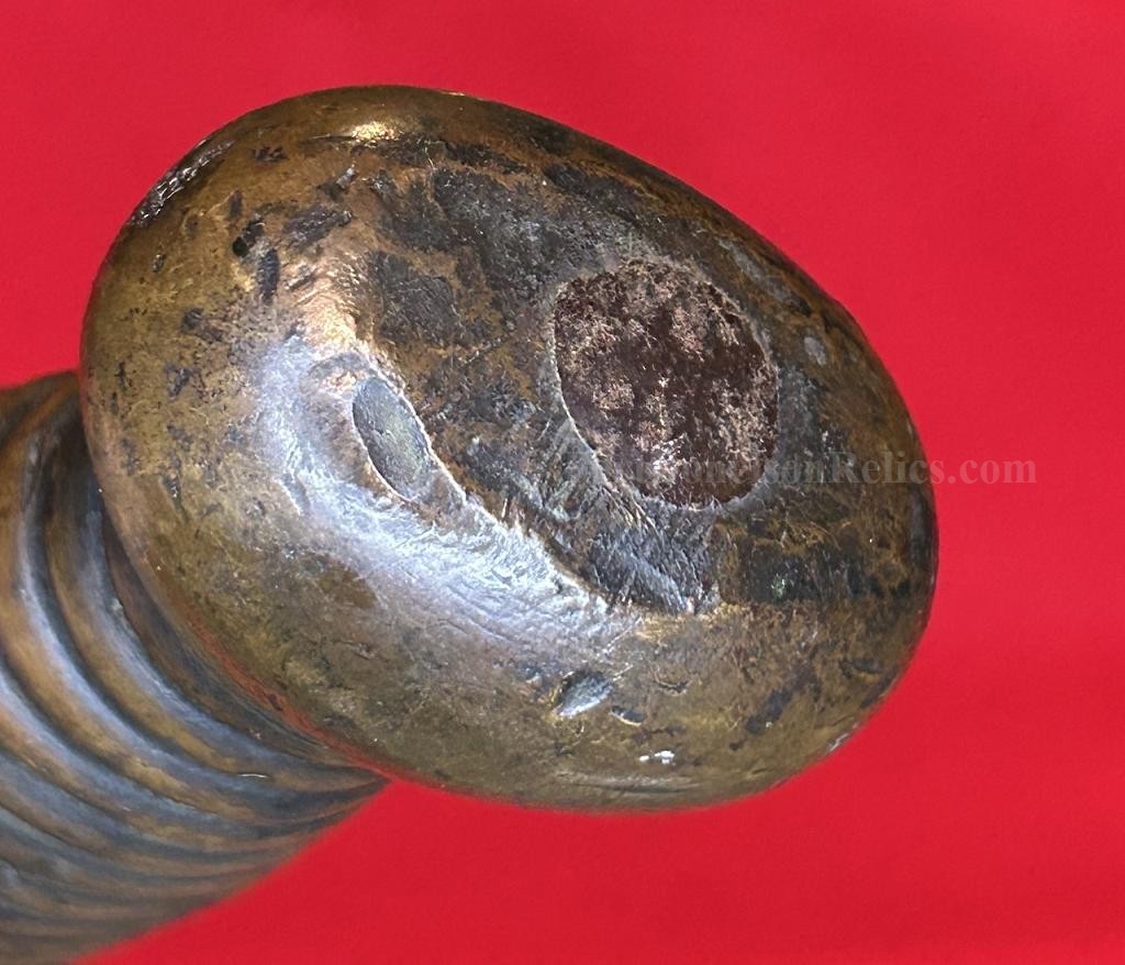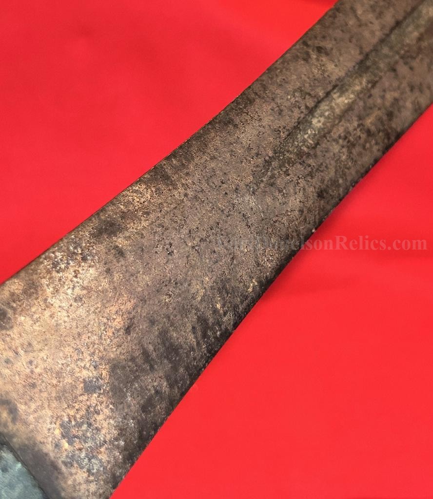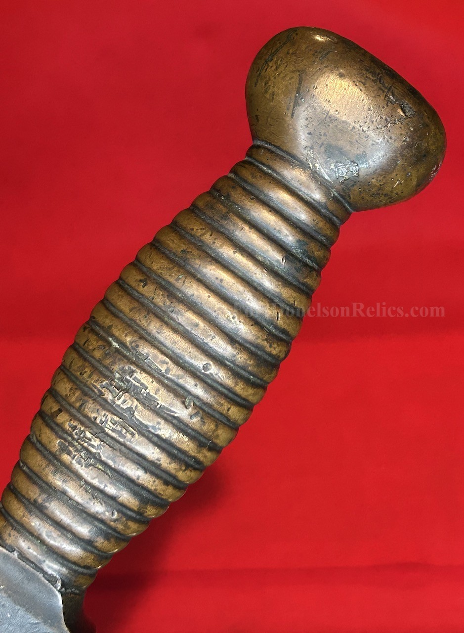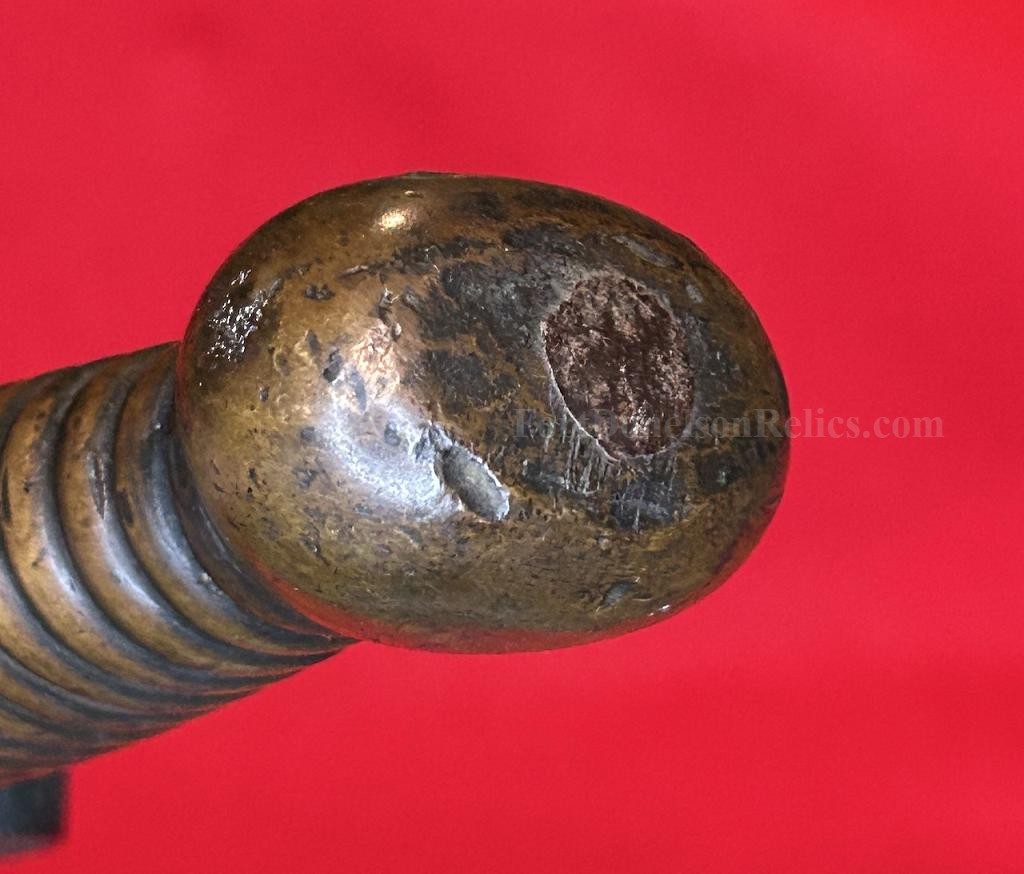 The solid cast brass handle has a nice patina throughout and the ping is smooth. The blade has the 3/4 fuller on both sides of the blade, which gives the appearance of an early battlefield recovery. There are some dings in the blade, as seen in the images, but otherwise the sword is solid and stable. There is no scabbard accompanying the sword.