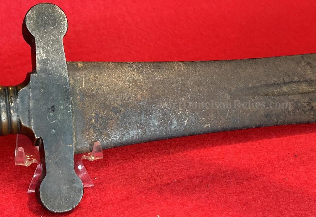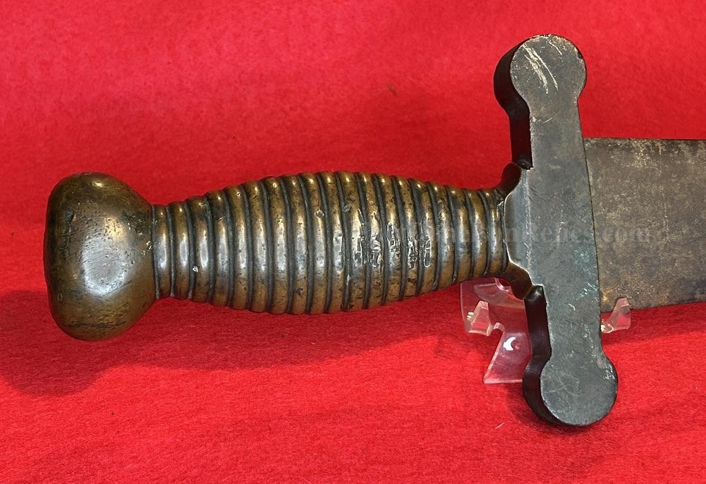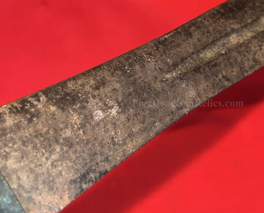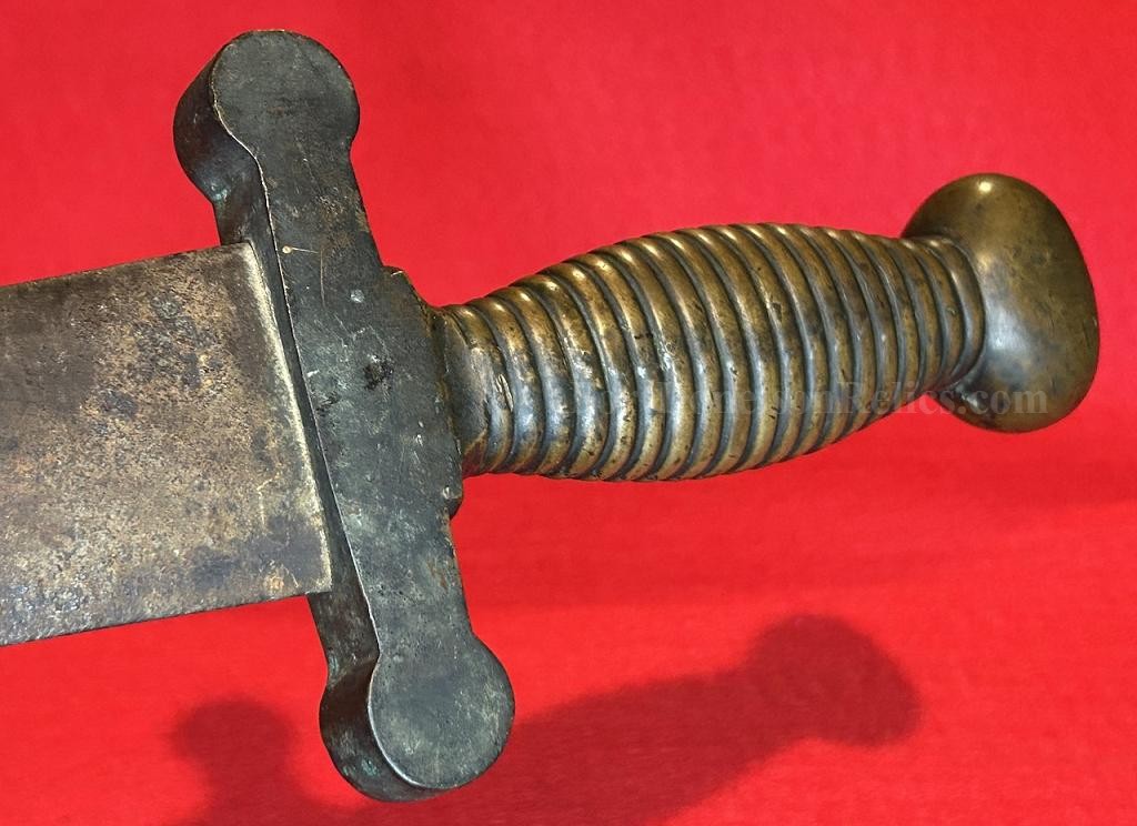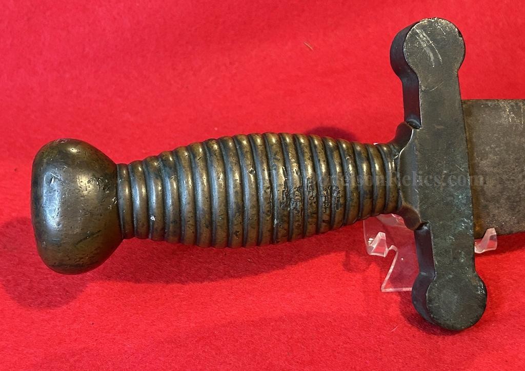 The solid cast brass handle has a nice patina throughout and the ping is smooth. The blade has the 3/4 fuller on both sides of the blade, which gives the appearance of an early battlefield recovery. There are some dings in the blade, as seen in the images, but otherwise the sword is solid and stable. There is no scabbard accompanying the sword.