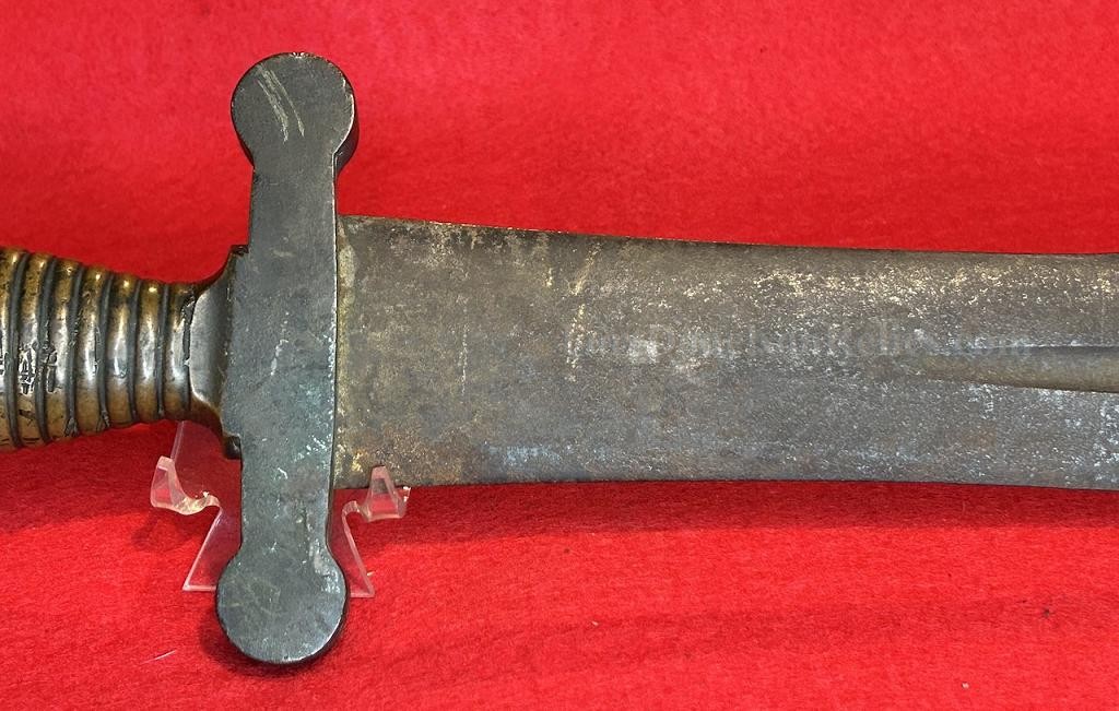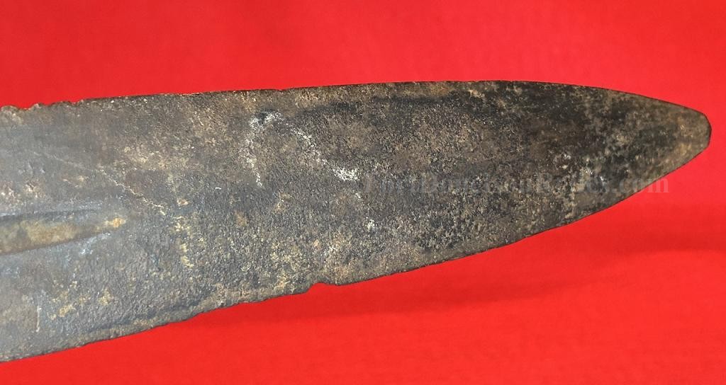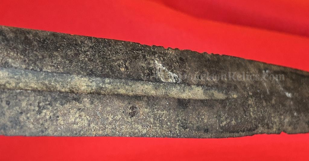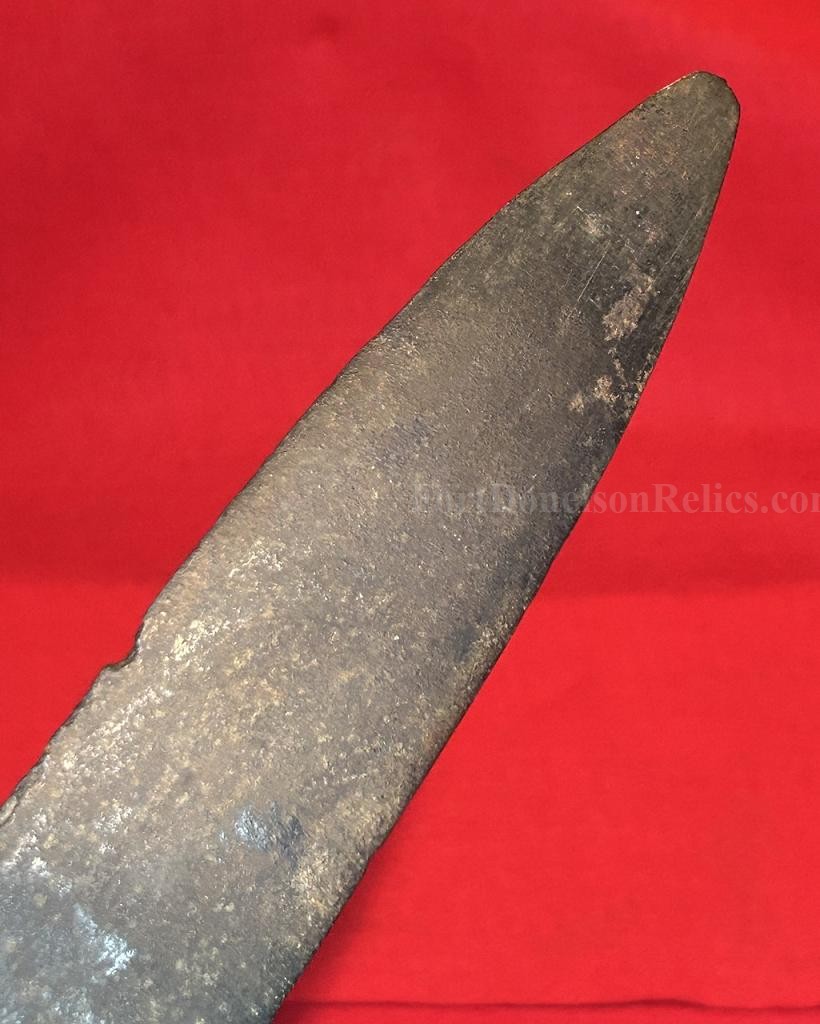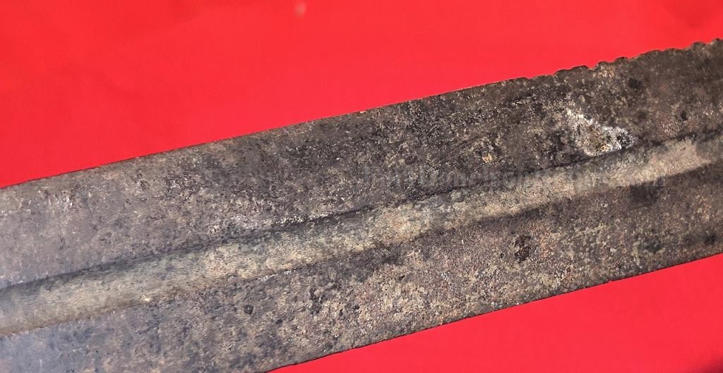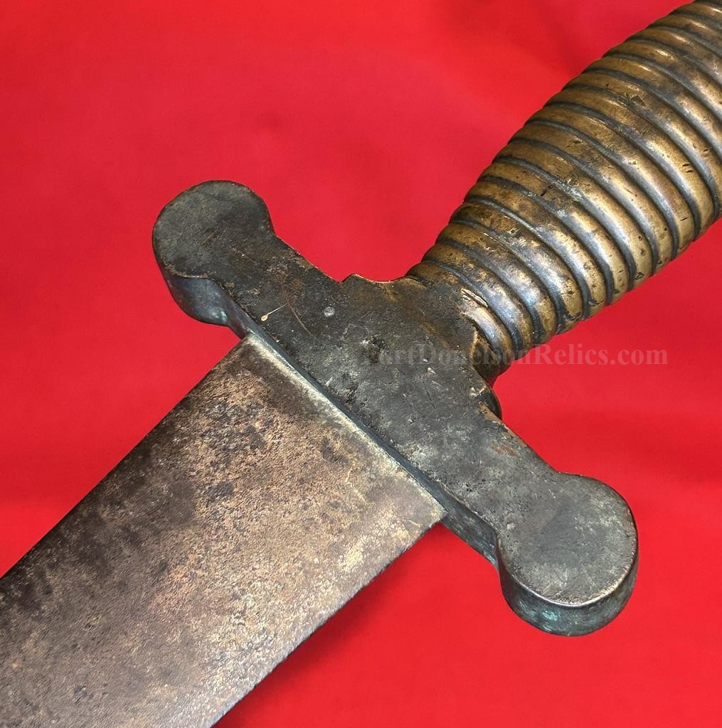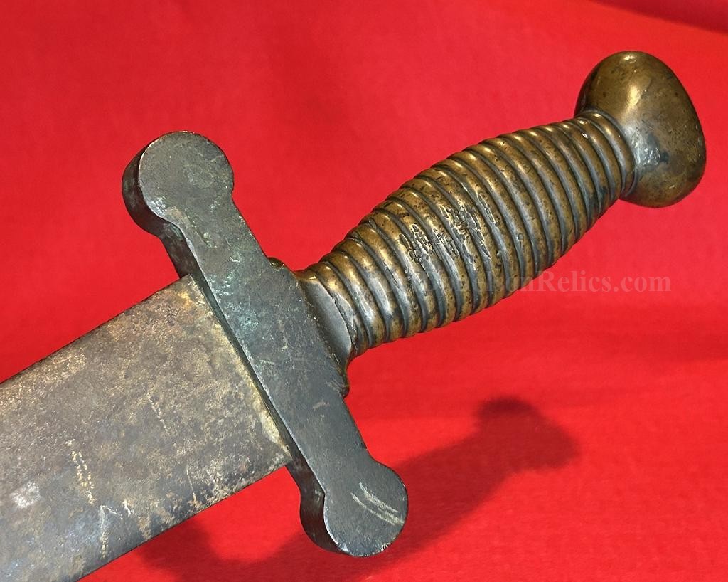 The solid cast brass handle has a nice patina throughout and the ping is smooth. The blade has the 3/4 fuller on both sides of the blade, which gives the appearance of an early battlefield recovery. There are some dings in the blade, as seen in the images, but otherwise the sword is solid and stable. There is no scabbard accompanying the sword.