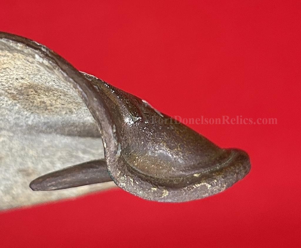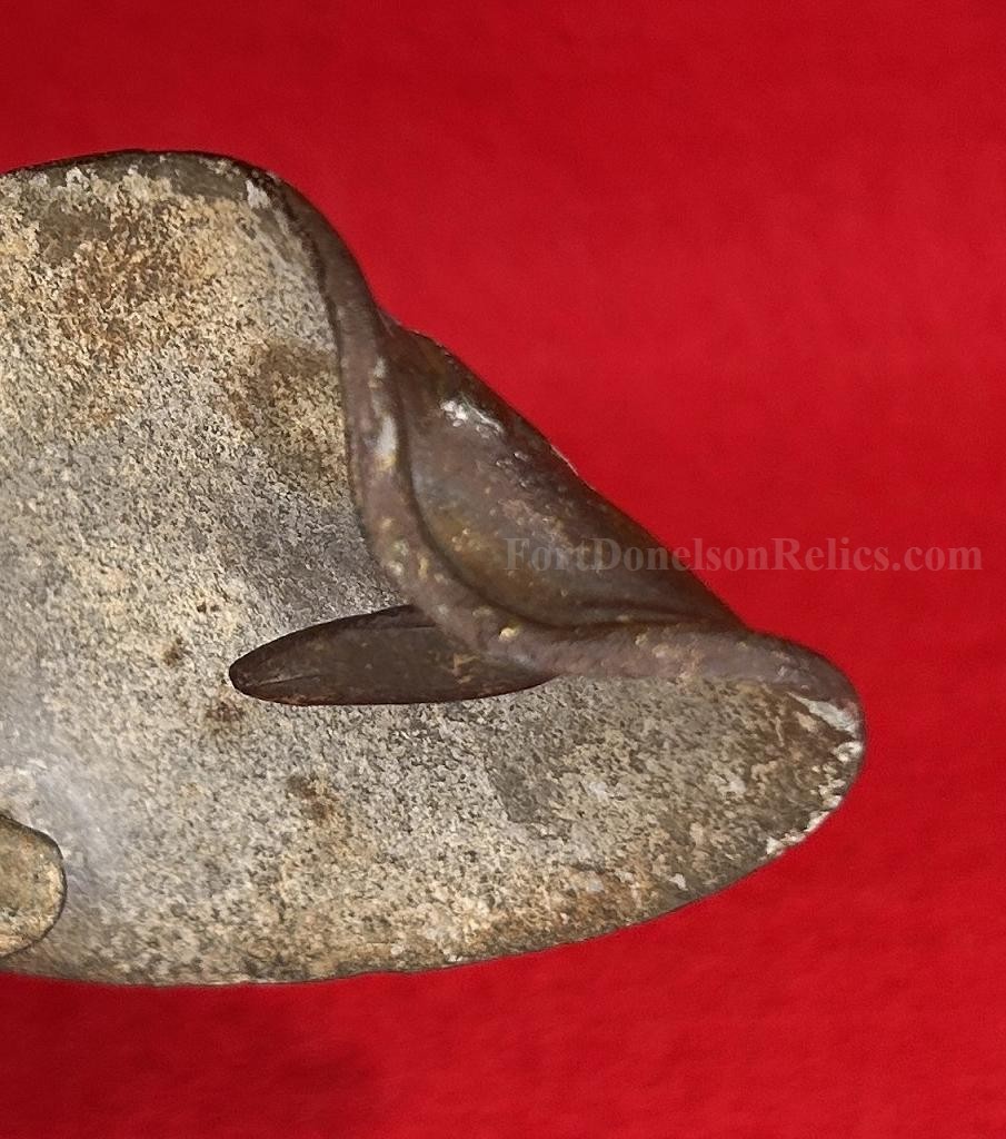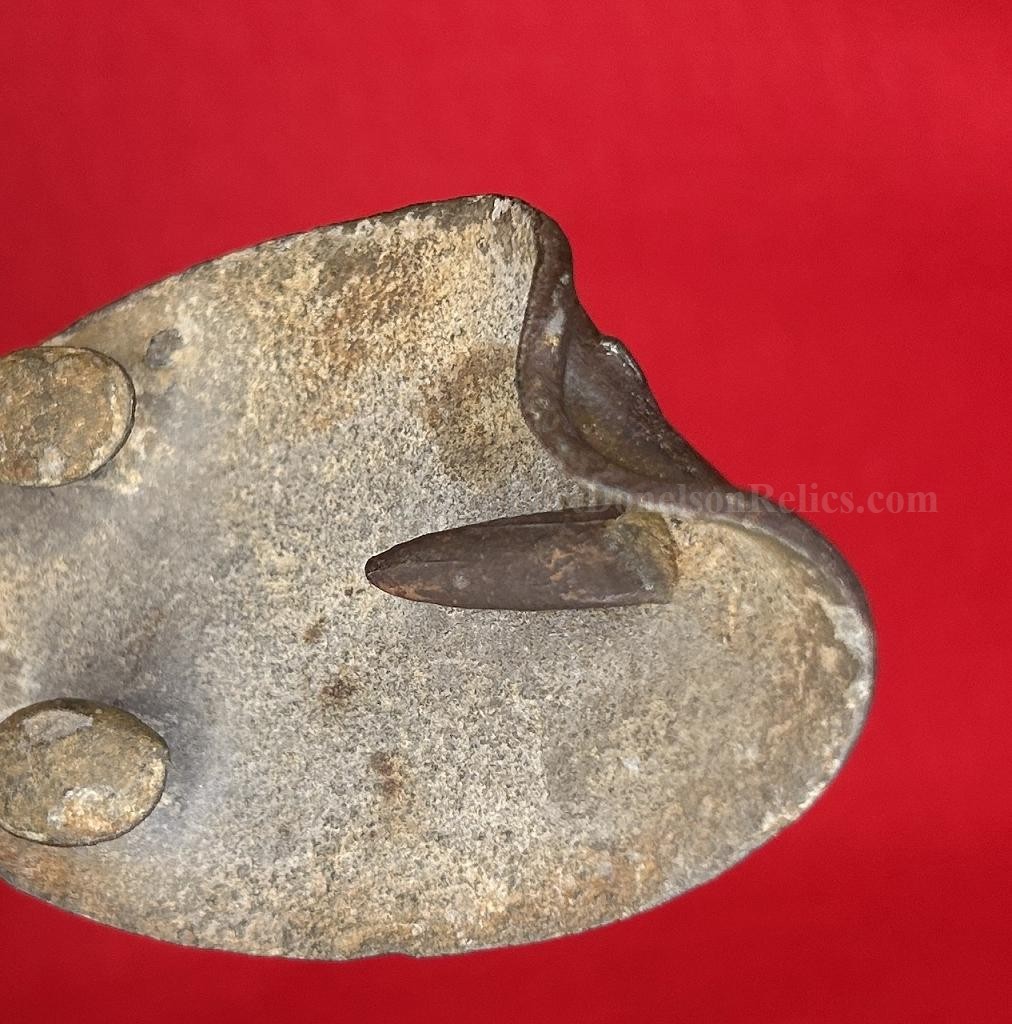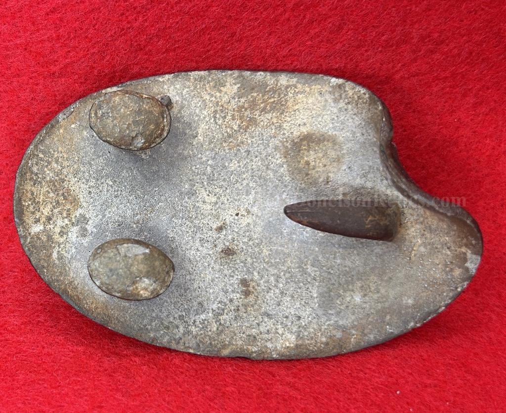 A cool looking US belt plate in dug condition, which appears to be an early find due to the condition. The plate is bent back at about the 11o'clock position which appears to be bullet struck or damage - whatever it was hit by was hard and fast. All of the lead fill is present and it retains all of the attachment hooks and adjustment hook. The brass face has a nice mellow patina. The recovery site is unknown - but is a really cool looking plate.