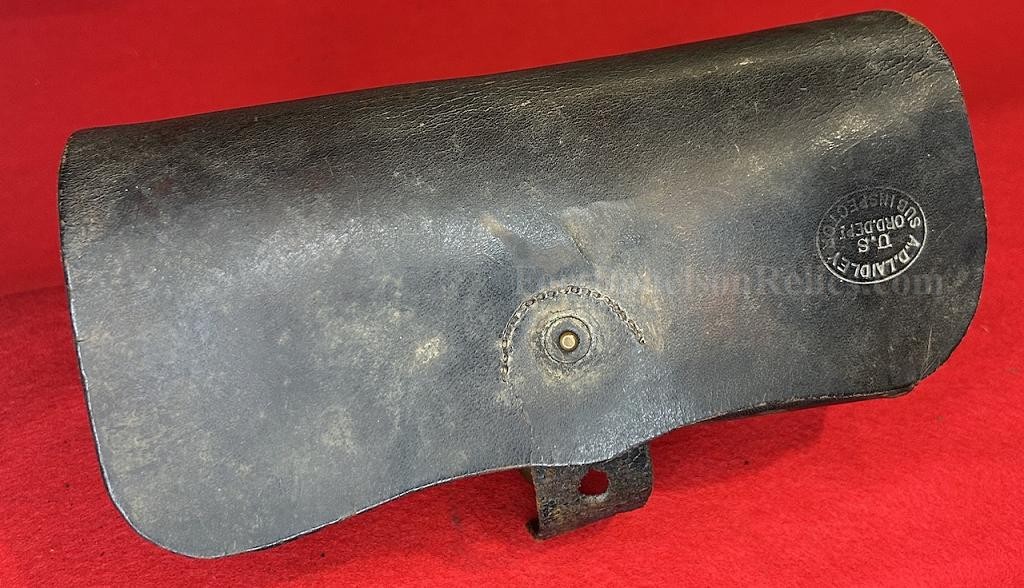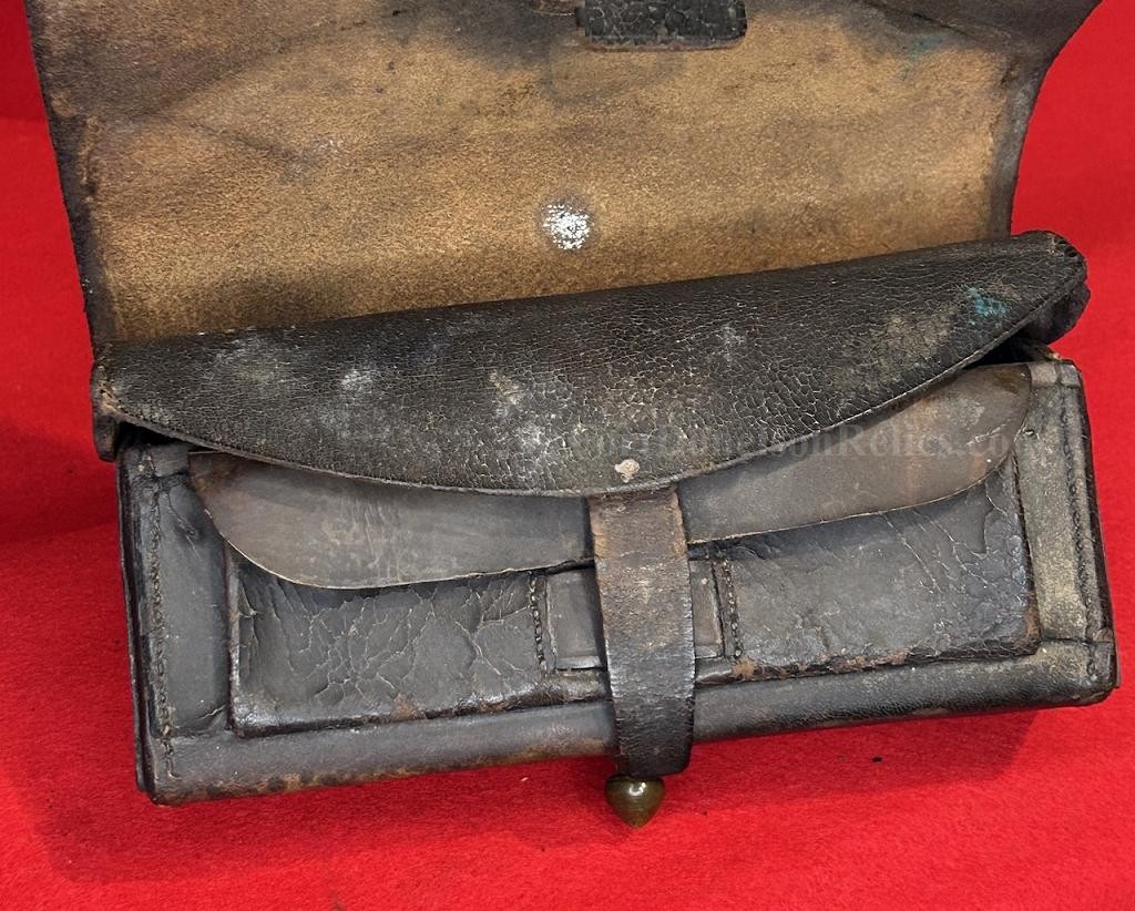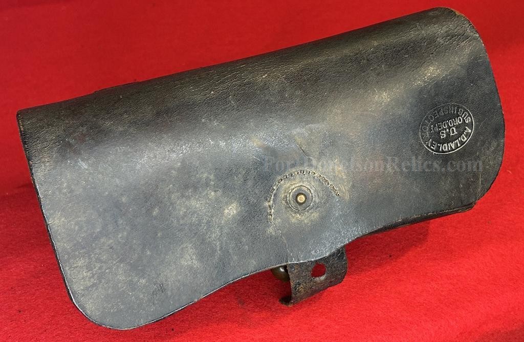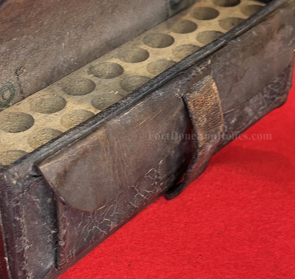 A really nice carbine cartridge box in great condition. The leather is still pliable. Retains both belt loops, finial w/ outer latch strap, and wood insert. You can see on the outer flap, it has the US Ordnance Sub Inspector's Mark which is solid and stands out. This is most likely for a Spencer - the wood block holds 20 rounds.