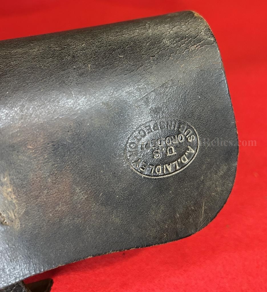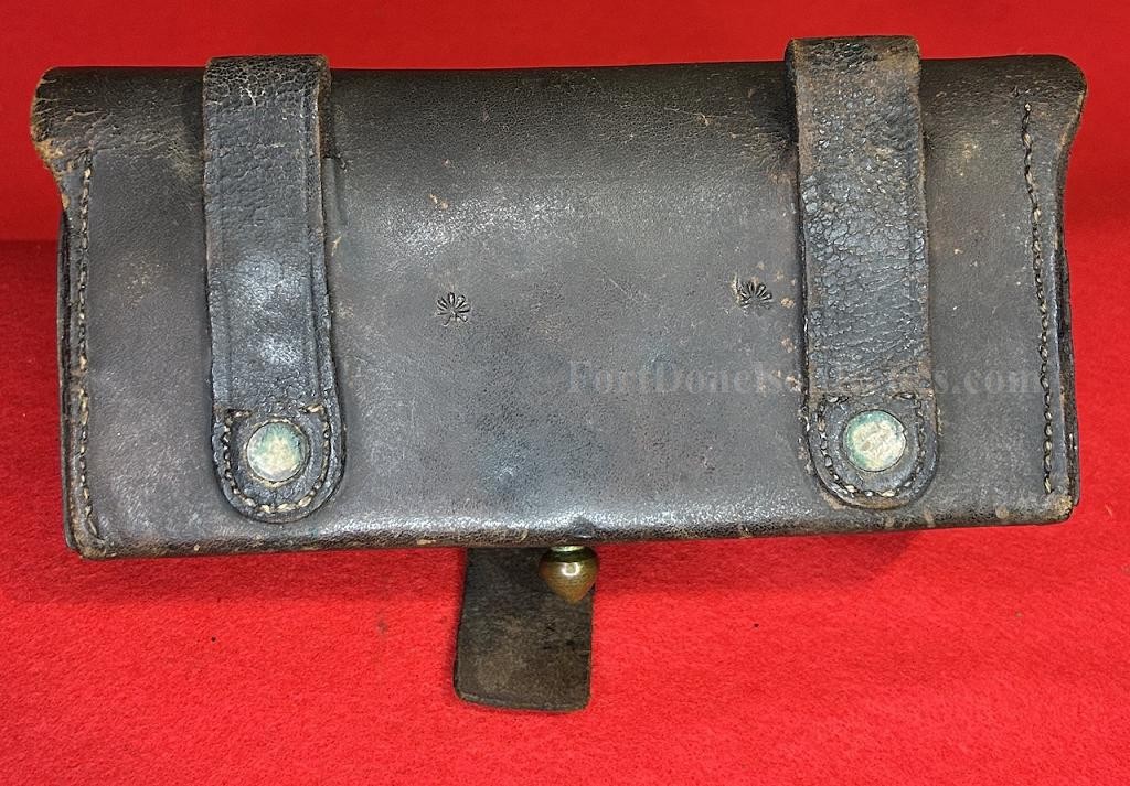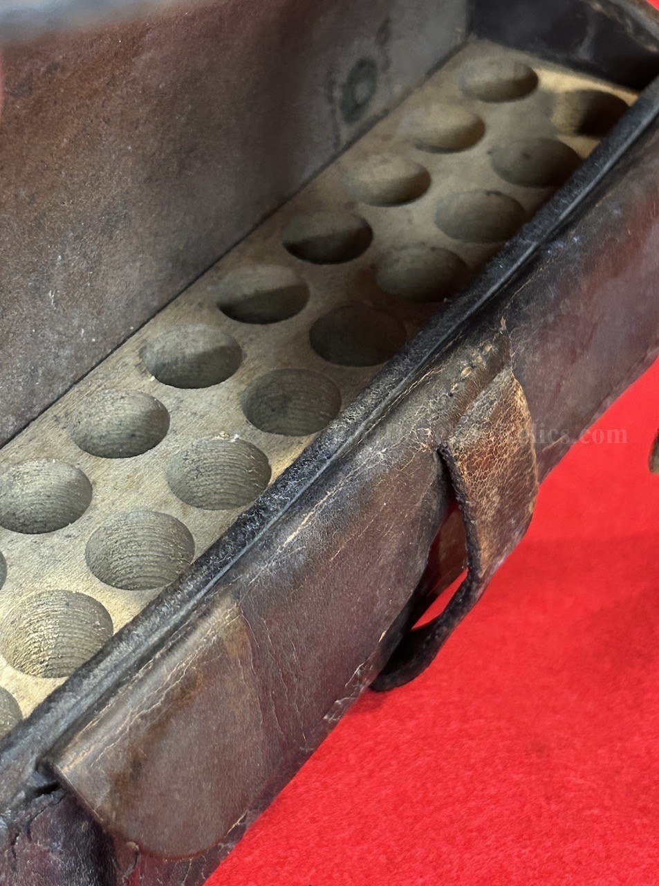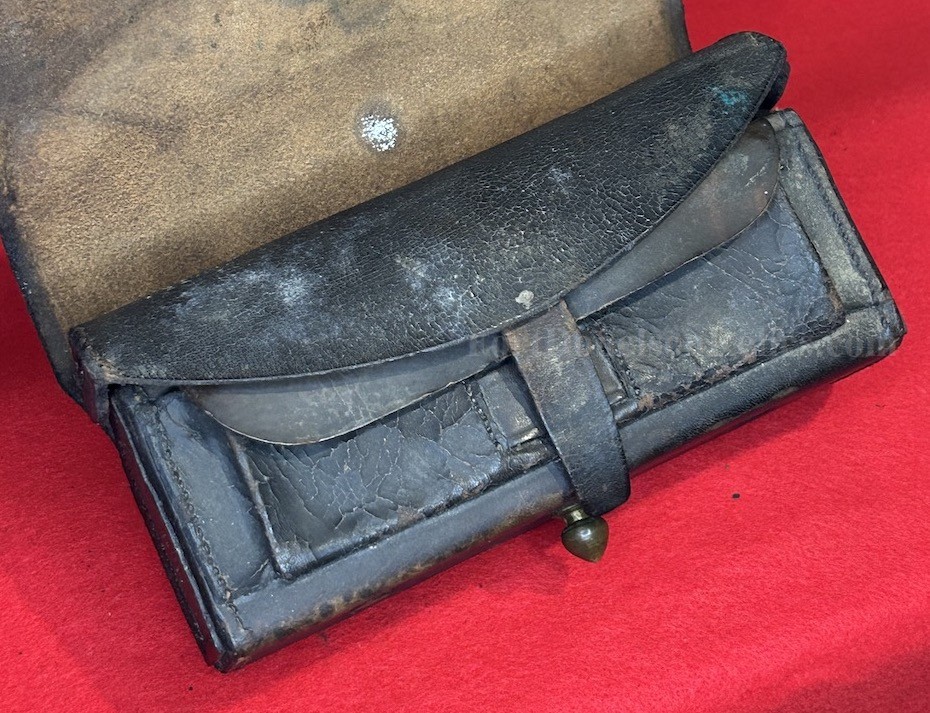 A really nice carbine cartridge box in great condition. The leather is still pliable. Retains both belt loops, finial w/ outer latch strap, and wood insert. You can see on the outer flap, it has the US Ordnance Sub Inspector's Mark which is solid and stands out. This is most likely for a Spencer - the wood block holds 20 rounds.
